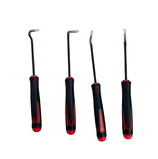 Set de 4 herramientas de precisión con puntas tipo gancho y punzón, diseñadas para trabajos detallados como retirar retenes, juntas, sellos, o manipular piezas pequeñas. Mangos ergonómicos antideslizantes que brindan mayor control y comodidad durante el uso. Ideales para mecánica, electrónica y bricolaje.