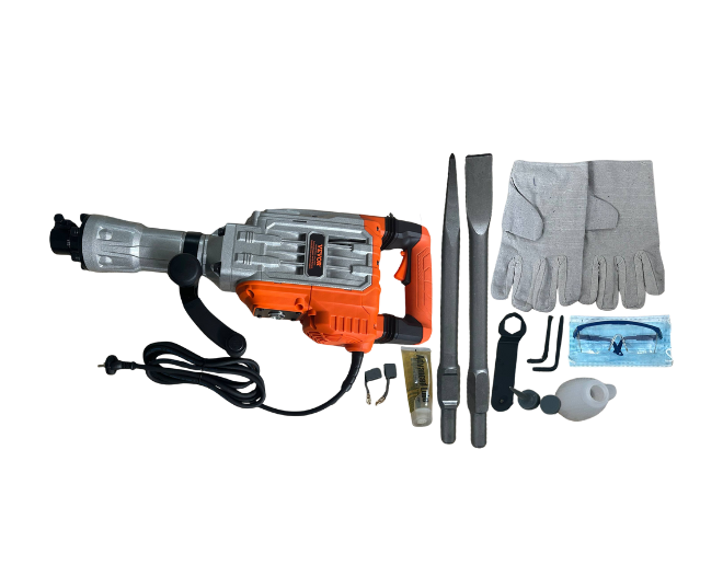 Martillo demoledor eléctrico de alta potencia, ideal para trabajos de demolición en hormigón, ladrillo y mampostería. Incluye accesorios como cinceles, guantes y maletín para un uso completo y seguro.